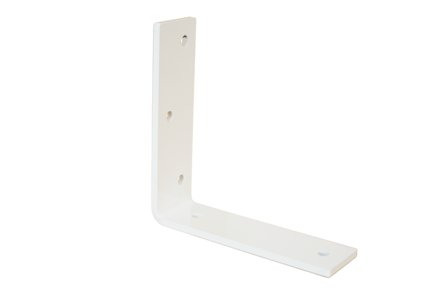 7" L style shelf bracket. Each bracket is powder coated gloss white. Powder coating is a very durable finish that is oven baked. Bracket is 7" long x 1.5" wide x 7" high. Fasteners not included.